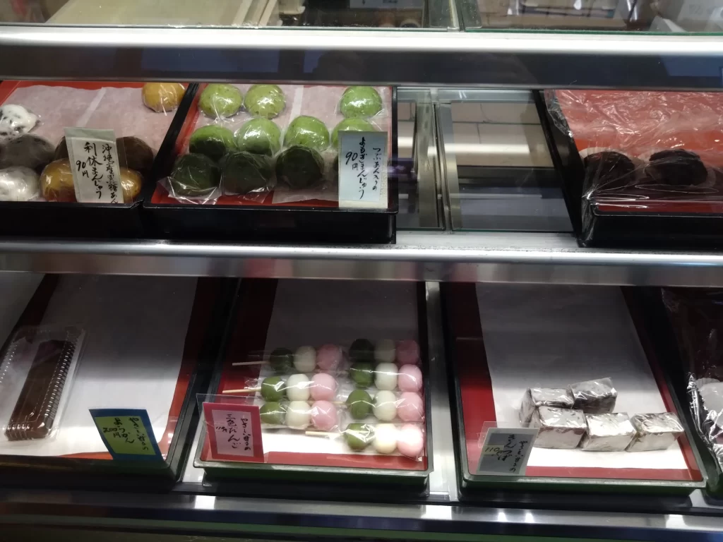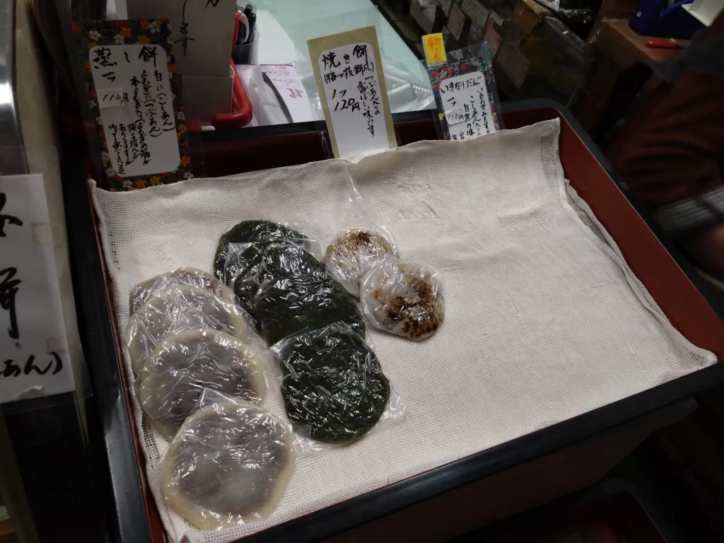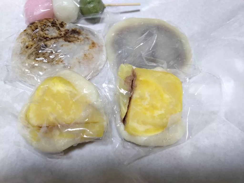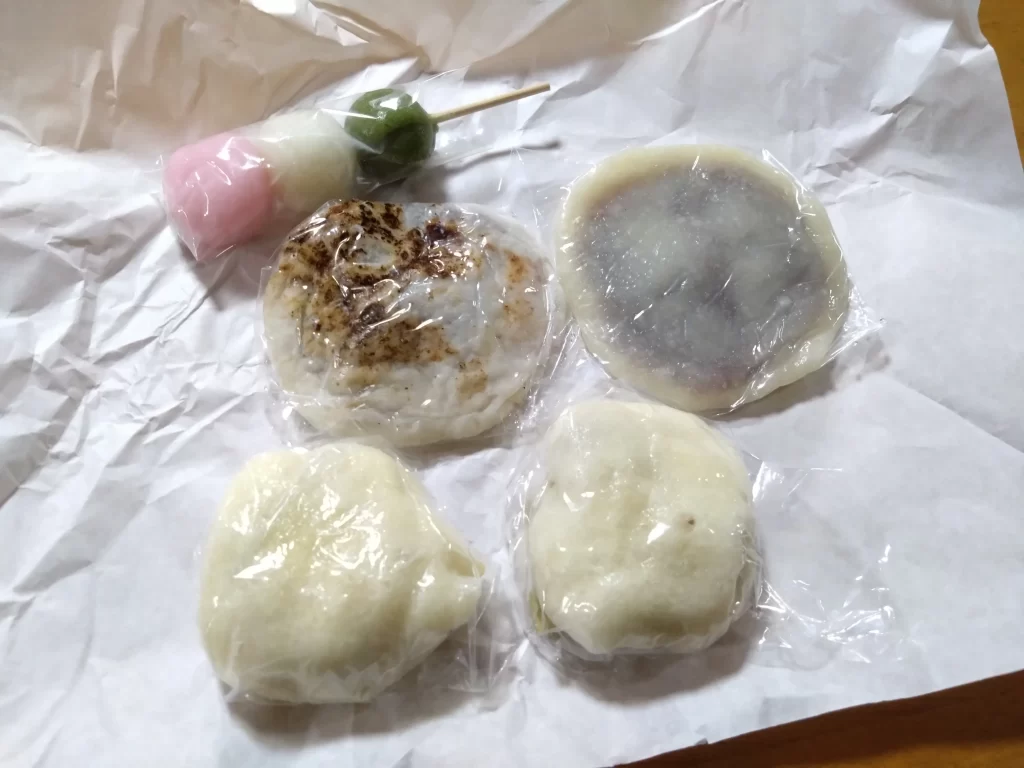 いきなりだんご2つ、三色団子、蒸し餅、焼き餅を購入